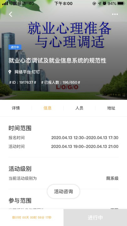 2020年4月13日星期一晚7:00工程学院毕业班在钉钉群组织召开关于“大学生就业心态调适及就业信息系统的规范性”主题知识讲座。本次活动由工程学院学生会在到梦空间发起活动,毕业班学生积极报名参加。