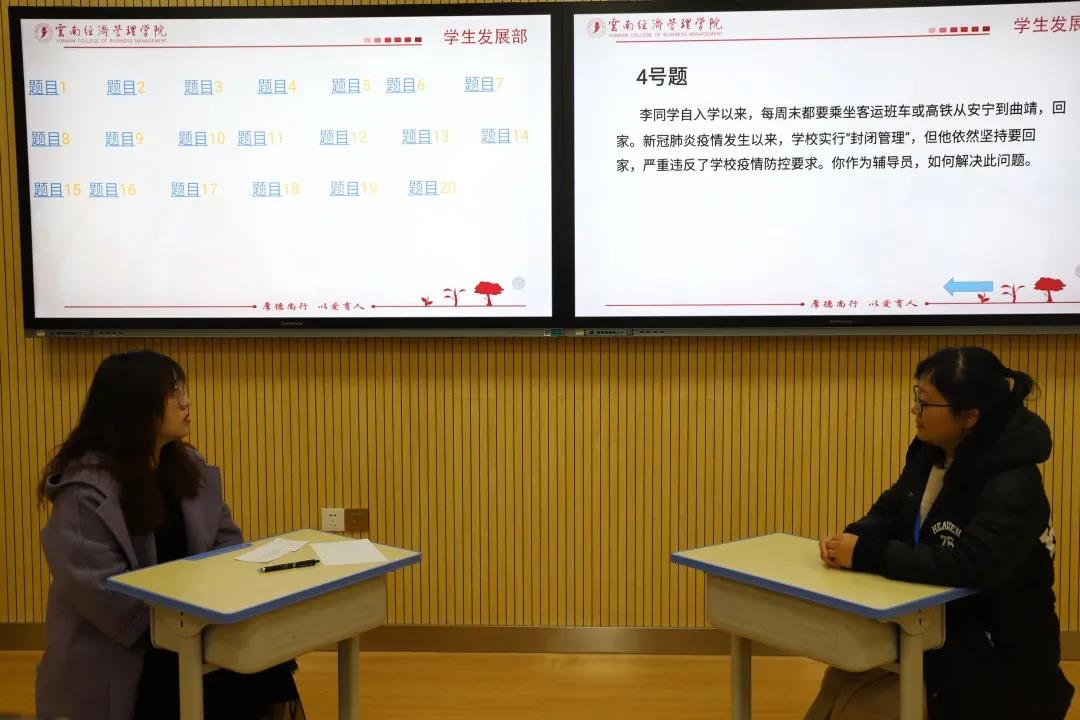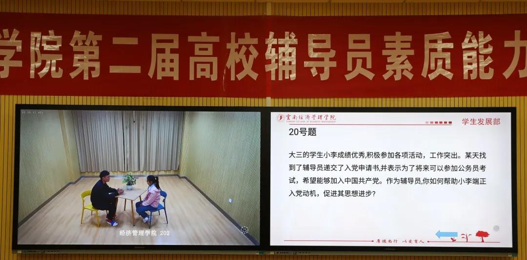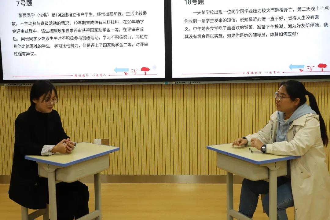 据了解,此次活动严格按照省赛最新规则组织。比赛在完成了严格的笔试考试环节之后,依次进行了案例研讨、谈心谈话环节。首先进行的是谈心谈话环节。值得关注的是,本次谈心谈话参照最新赛制,将谈话场景设置在专门谈话室,评委通过屏幕进行打分。教育学院利用现有微格实验室实现了这一新要求。很好的保障了谈心谈话效果,更真实还原谈话过程。谈话内容以如何解决学生的宿舍矛盾、如何提高学生的集体团结意识以及如何去解决学生的心理异常等一系列围绕辅导员九大问题展开,很好考察辅导员解决问题、政策法规掌握、谈话技巧、应变等能力。