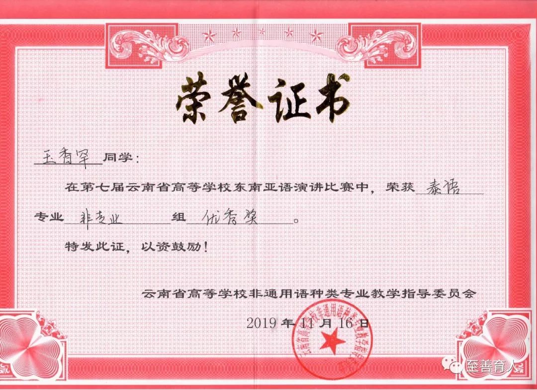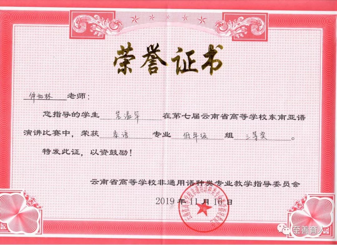 2019年11月15-16日,云南省高等学校第七届东南亚语演讲比赛在云南师范大学呈贡校区举行,来自全省开设东南亚语种教学30所高校的125名选手参加了比赛。我校2018级应用泰语班岩温罕、玉香罕两位同学在教育学院泰语教师仲如林、外教张丽娟老师的带领下参加了本次比赛。